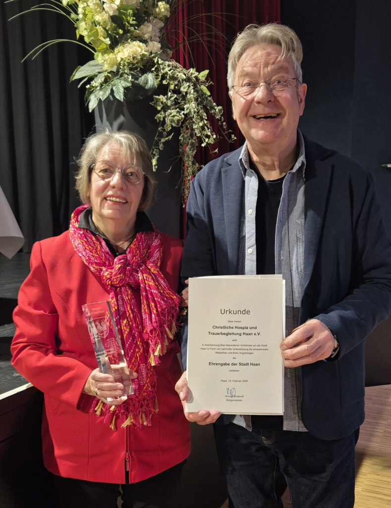 Seit nunmehr 20 Jahren begleitet unser Verein schwerkranke und sterbende Menschen sowie deren Angehörige in Haan und Gruiten. Mit Zeit, Mitgefühl und einem offenen Ohr stehen unsere haupt- und ehrenamtlich Engagierten den Betroffenen zur Seite und leisten einen wichtigen Beitrag für unsere Stadtgesellschaft.